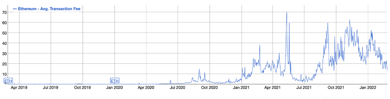 Let’s look in particular at Ethereum, which has exploded in popularity in the past few years. These fees, commonly known as “gas fees” within the Ethereum user base, have ranged sharply over the past few months: